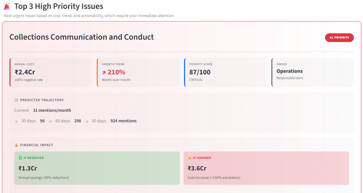 Finlytix ties every complaint to the exact product issue and ranks them by business impact. Your roadmap becomes clear and defensible.