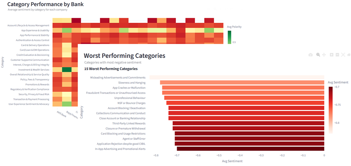 Finlytix identifies the most active entity–aspect combinations across cards, banking, lending and UPI, surfacing early failure patterns and sentiment shifts long before they appear in complaints or performance metrics.